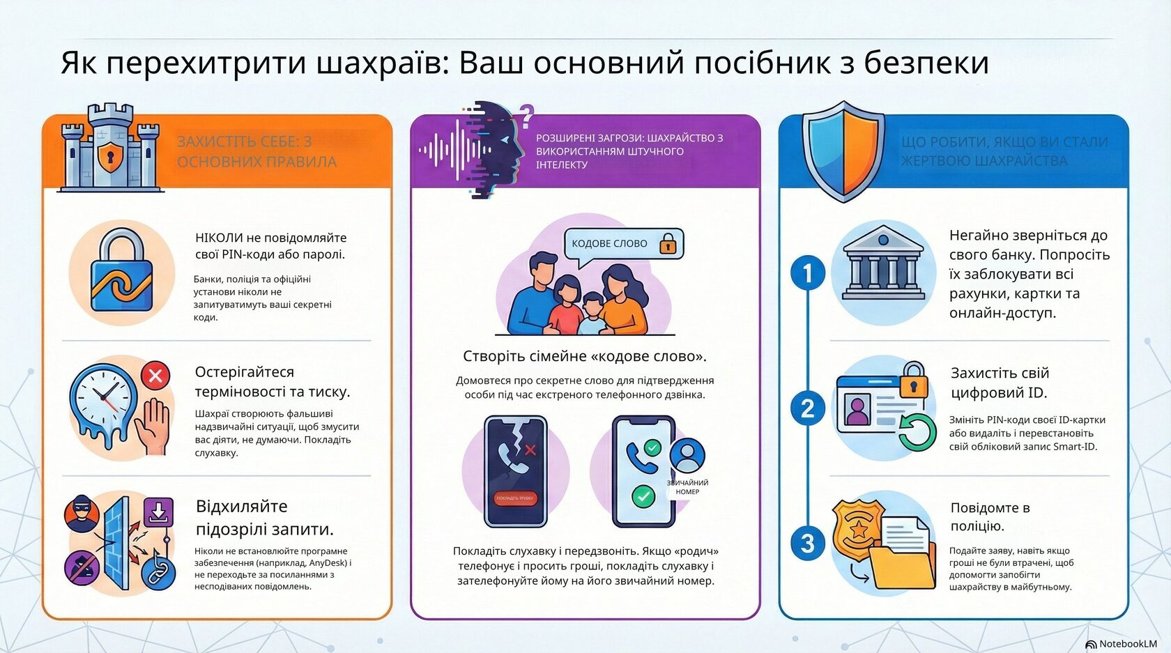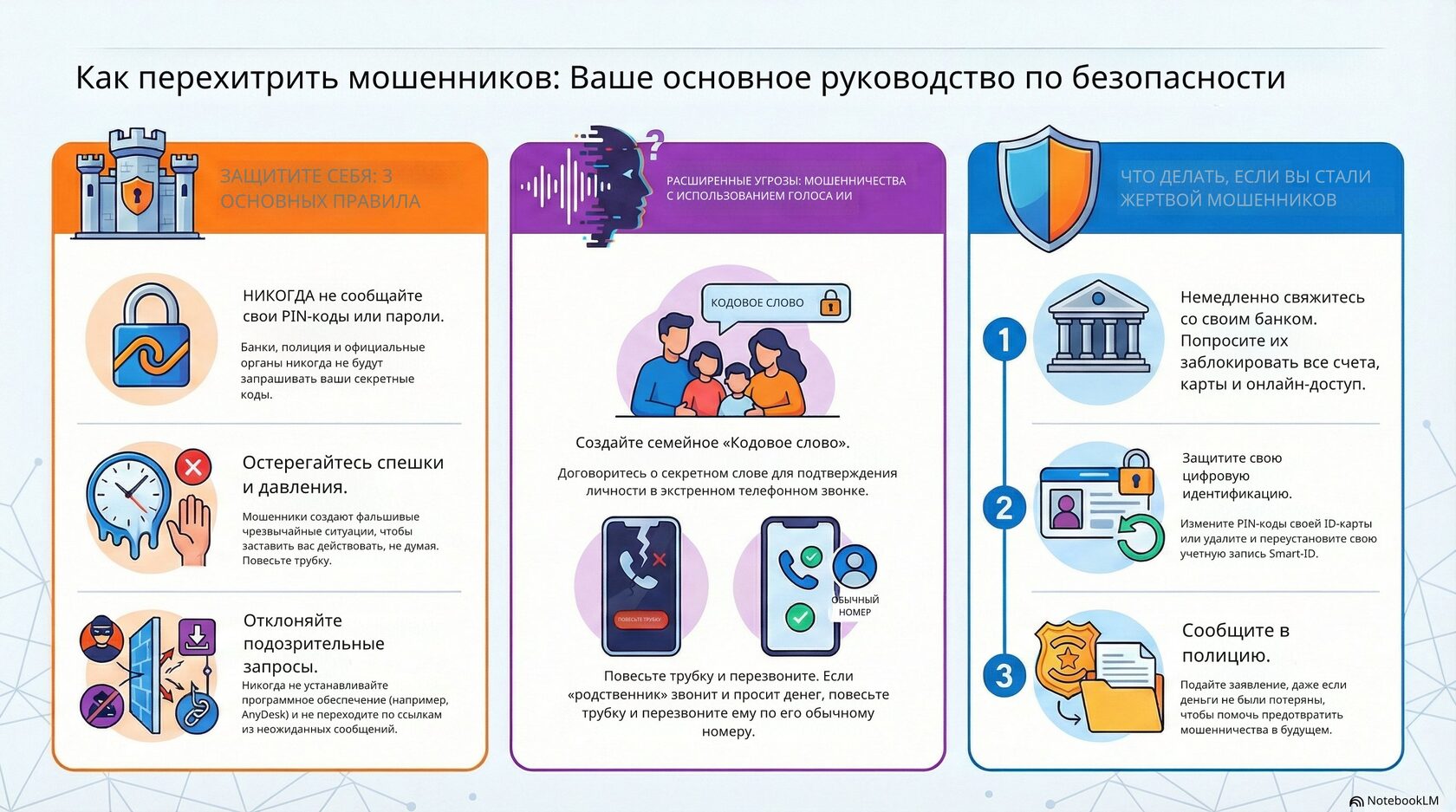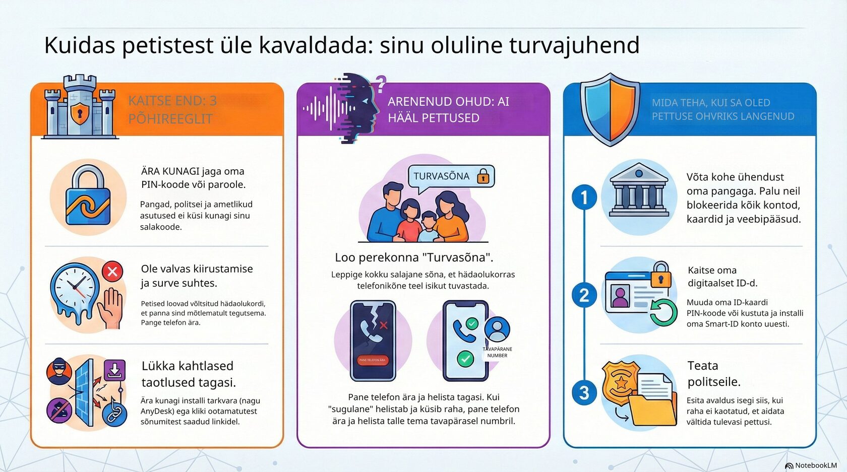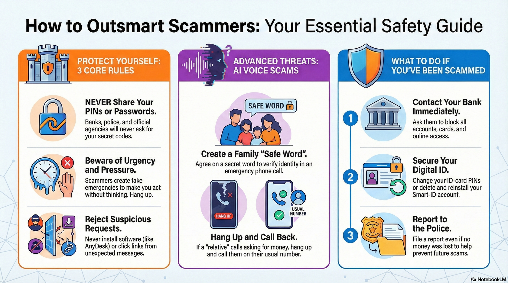 - Pea meeles ametiasutuste volitusi: pangad, politsei ja riigiasutused ei küsi kunagi telefoni teel paroole, PIN-koode ega ligipääsu sinu kontodele.